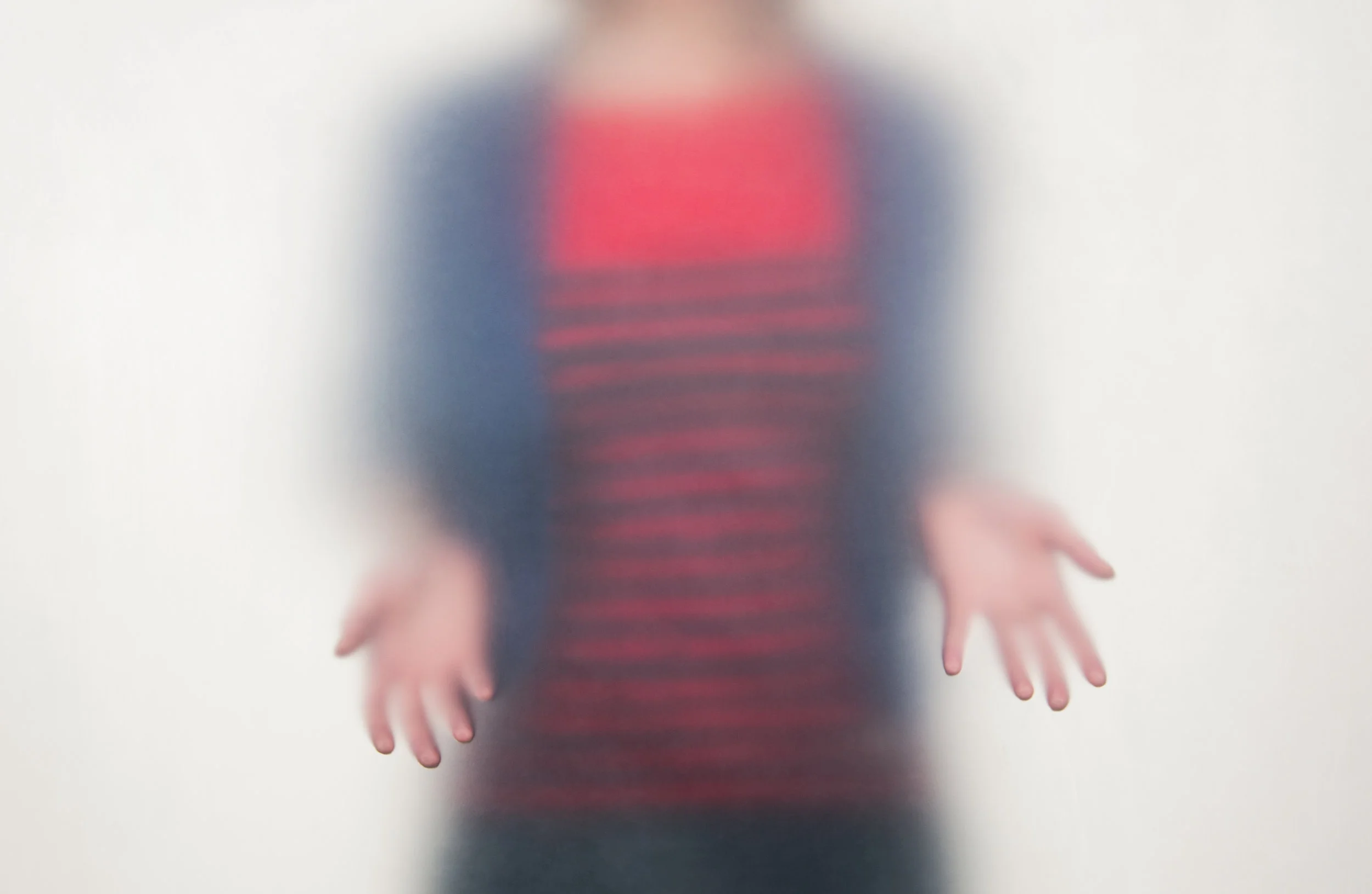 Her resulting portraits share an ethereal quality. They capture expressions of intense inward focus as the subjects—unable to see behind the membrane—shed recognition of the camera and concentrated on the artist’s verbal prompts. Faces are elusive, obscured by the material that only renders sharply the contact of touch. By trading literal appearance for a less tangible resemblance, a different kind of portrait emerges—one that is at once intimate and ineffable.